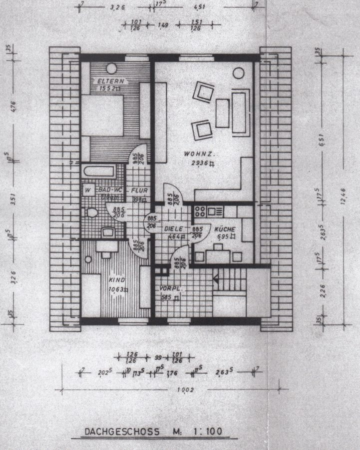 Wohnzimmer, Elternschlafzimmer, Kinderzimmer, Badezimmer, Küche, 2 Flure, Balkon